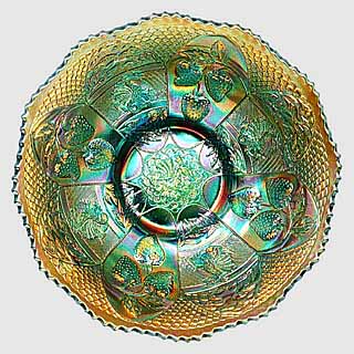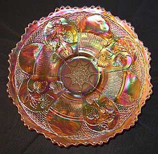 At the right is an extremely rare Dragon and Strawberry 9-inch plate in marigold. It is referred to as the Absentee Dragon due to the fact that it does not have the dragon part of the design. There are one or two of these known. This one sold, in 2017, at the American Carnival Glass Association convention for $40,000. |