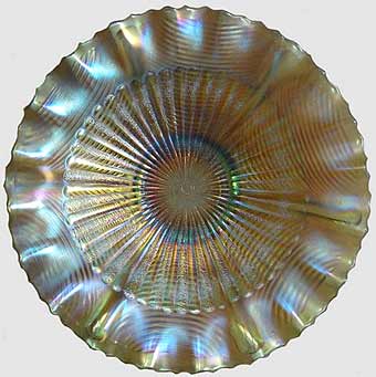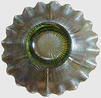 | The unusual Drapery bowl above is the only one known made from the rosebowl mold. Although not apparent, it is in the lime green base glass color. It is also notable because it has a pie crust edge and is the only known piece of Drapery with an interior pattern (Stippled Rays). Many thanks to the owner Don Ruppel who sent the photos. | |
