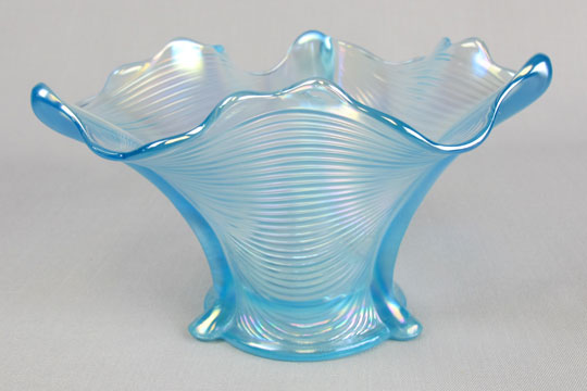 Unlike most Northwood patterns, aqua opal is the most common color in rosebowls, while marigold is quite scarce. In candy dishes, ice blue is the most common color and marigold again scarce. |