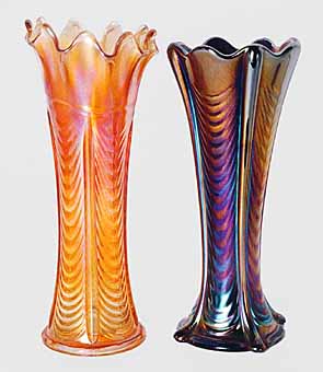 In the photo to the right are a Drapery Variant vase. Notice that this vase does not have the small toes but rather a collar base. Also shown is a Drapery Footed Variant vase. Unlike the regular vase with three vertical ribs and toes, the footed variant has four ribs and toes. Both the variant and footed variant are seen much less often than the regular vase. |