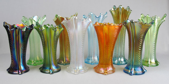 | Drapery vases are available in a range of colors and are made from the same mould as the candy dish above. Colors shown above, from left to right, are blue, ice green, green, aqua opal, white, ice blue, marigold, aqua, sapphire and lime green. Amethsyt and light blue opal are also known.