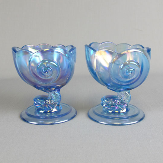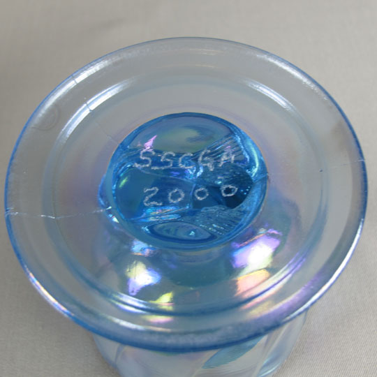 In 1999, the Sunshine State Carnival Glass Club used the 2 3/4 inch version as its convention souvenir. On the back was etched "SSCGA 1999" and then the number of the item out of 170 pieces made. In 2000, the Sunshine State group issued another souvenir. This time a pair of seashell candleholders on a dolphin stem. They are etched "SSCGA 2000" on the bottom. This was originally a Cambridge mold and part of a larger line of seashell items. Imperial purchased Cambridge and when Imperial closed their molds were sold to various companies including Fenton and Summitt. |
