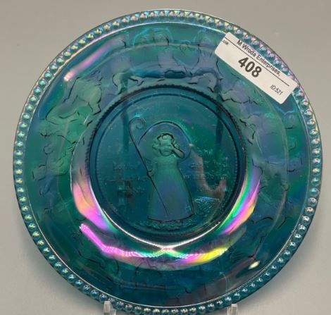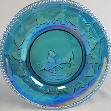 The plates are 6 1/4 inches in diameter with the pattern on the reverse side. The reverse pattern is in the glass not raised off the glass. The plates may have a border of Dutch children holding hands and dancing as shown in the two plates above. Some plates have bears in the border. It seems that the border is inter-changable. Only the front is iridized. The front has no pattern except beading around the outer edge. |