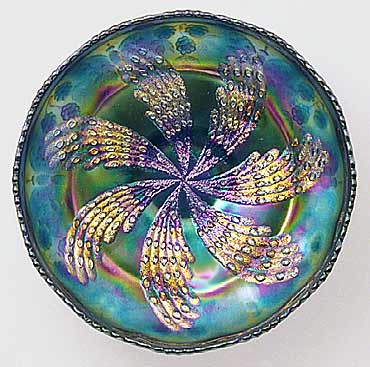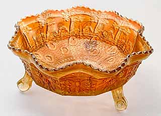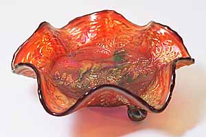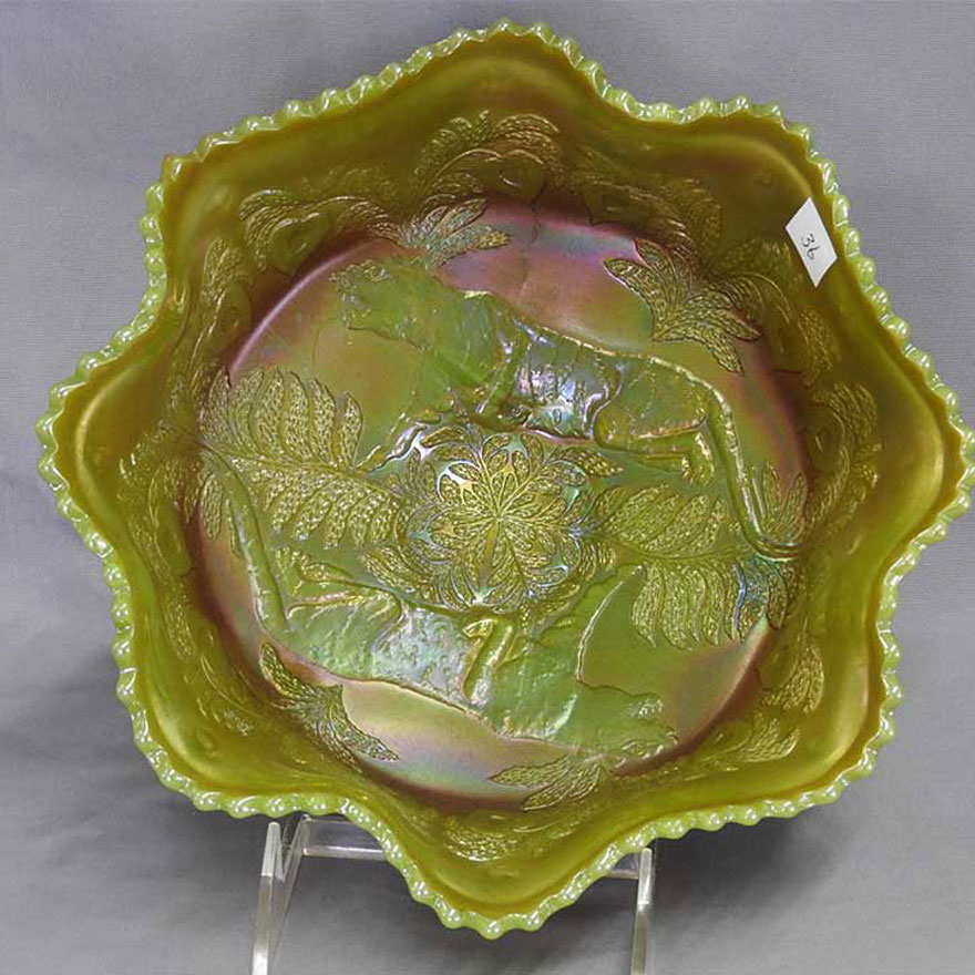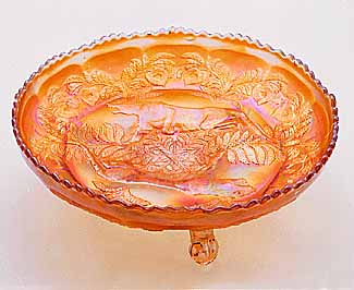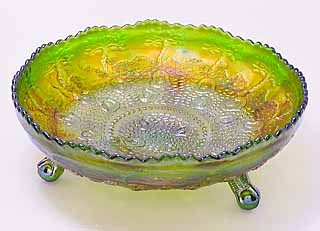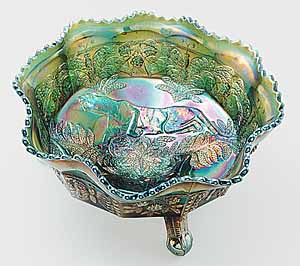 At a glance, this pattern would appear to be Butterfly and Berry; that's what the exterior pattern is. The interior, though, is the seldom seen Hearts and Trees pattern that has heart-shaped leaves on the bottom and trees along the sides of the interior, almost like a forest glen. Closely related to Heart and Vine and Stream of Hearts. These bowls are known almost exclusively in marigold like the one at the left. Few green example exist such as the centerpiece bowl on the right. Dean and Diane Fry report a bowl in blue. | |