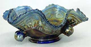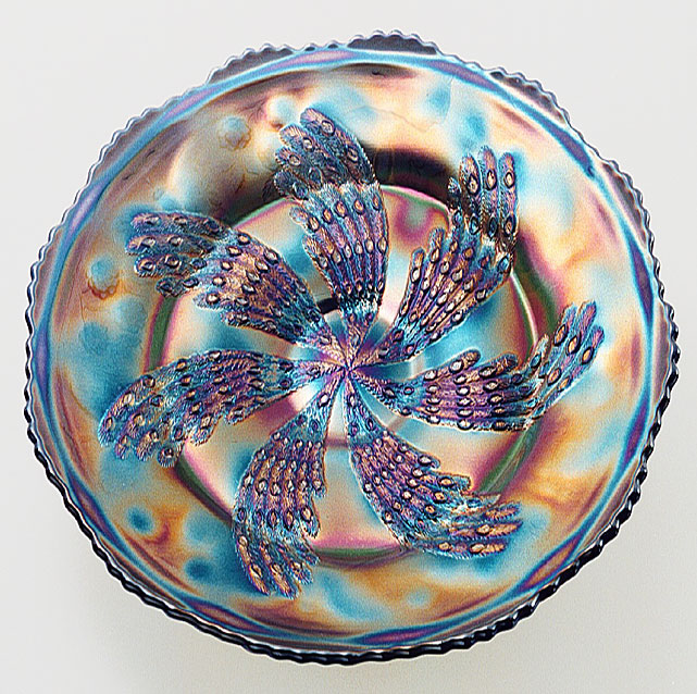 Fantail is one of several Fenton patterns that has the Butterfly and Berry motif on the exterior; there are three ball feet. Above are an electric blue ice cream shaped bowl and one of two known blue chop plates. There are also two chop plates in marigold. Colors are blue, green and marigold.