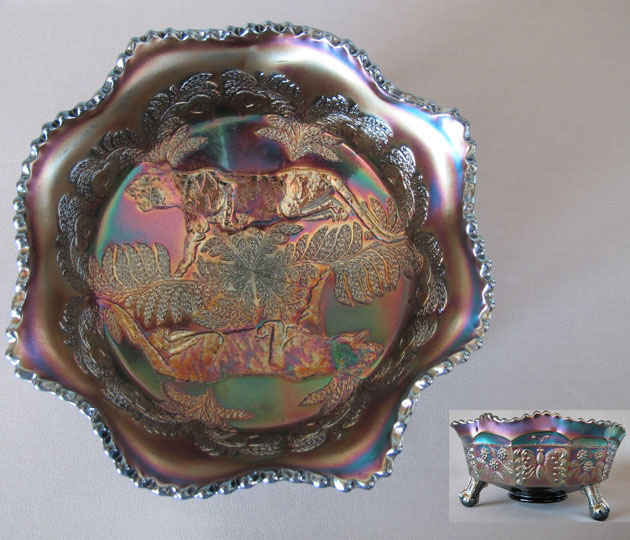 This pattern is named for its interior motif--the exterior is Butterfly and Berries. There are two cats that have come to be known as panthers--though they could be almost any large feline. Shown above is a large ruffled berry bowl in green and a round, spread out bowl in marigold commonly referred to as a centerpiece bowl. All pieces have ball feet. The large ruffled bowls com ein aqua, amethyst, blue, green, marigold, a rare nile green, olive green and white. | |