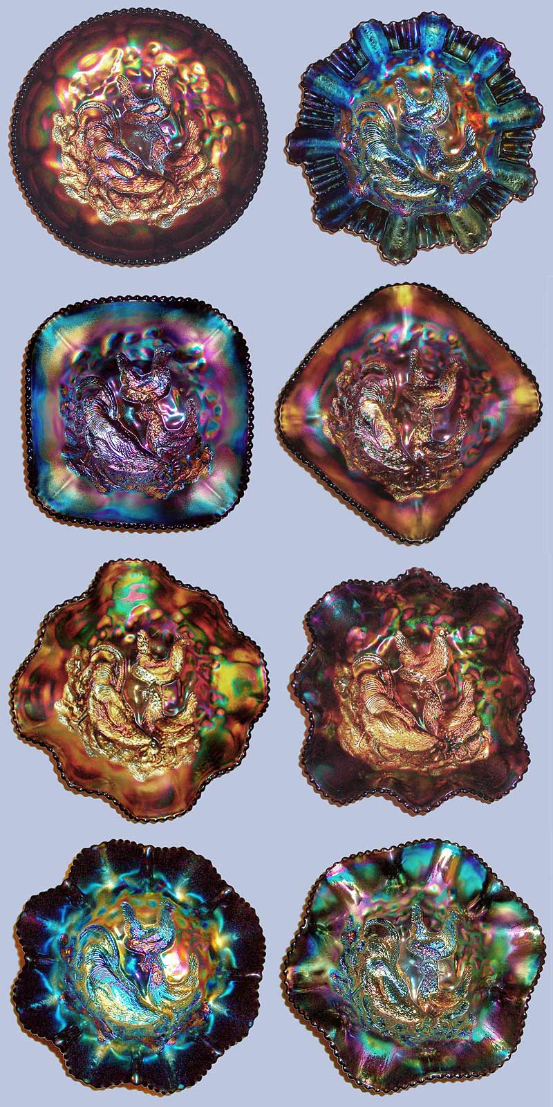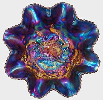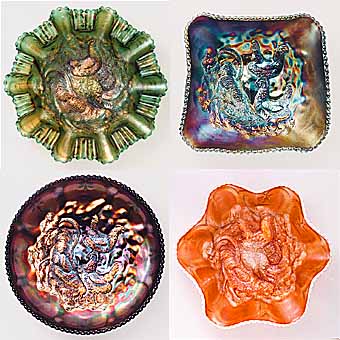 Dugan's Farmyard is one of the most desirable pieces in Carnival Glass. Despite their desirability, there are quite a few pieces around. Mostly seen in purple with a 6-ruffled edge; those with an 8 ruffles, as shown above left, are less often seen. Above right are some of the rarities in the pattern: Bowls in three-in-one green, a square purple (they are also ruffled in a squarish shape), a low bowl--almost a plate--in purple, and the only known peach opal example. All have Dugan's Jeweled Heart exterior.
