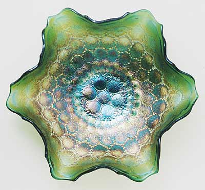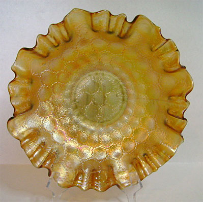 This pattern looks much like Fenton's Coin Dot, but with the addition of "stitches" between the dots. Bowls are about 8 and one half inches across which makes them larger than the Coin Dot pieces. A rather scarce pattern. One marigold rosebowl is reported. Found mostly in ruffled or ice cream shaped bowls but very occassionaly in a plate. Typically found in amethyst, aqua, blue, green, marigold and a rare red.