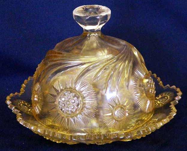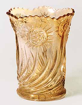 Previously, the only vase example seen or heard of in this pattern was this short marigold vase which sold at a 1993 auction for $60. There was minor damage. But then a marigold butter dish was found. Photo Courtesy of Seeck Auctions. |