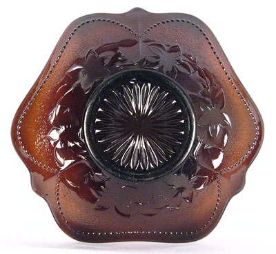 This pattern comes in small 6 to 7 inch bowls with ruffled, crimped or 2-sides up edges. It also comes in small plates with a crimped edge. Colors include amethyst and peach opal. Above are a crimped plate and a ruffled and crimped bowl. Both are in purple. |