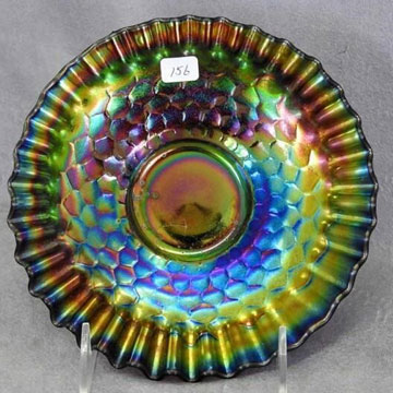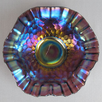 Peach opal is rare in Fishscale and Beads bowls and very rare in the plates. Amethyst/purple is scarce. Marigold and white are almost certainly Fishscale and Beads. Fishscale and Beads is often mistaken for Honeycomb and Beads. Fishscale and Beads has the interior pattern extending almost to the center while Honeycomb and Beads will have a large circle in the center that has no pattern. Crimped pieces will be Honeycomb and Beads. |