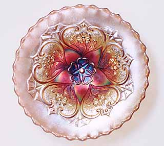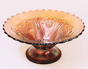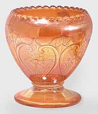 Similar to Dugan's Starfish which is found in compotes and bon bons. Five Hearts bowls, especially those that are pulled up and flared, are sometimes referred to as compotes. Above left is a beautiful, rare lavender bowl, courtesy of Janet Knechtel, and an amethyst bowl in the center with typical shaping. Also found in marigold and peach opal. There are only a few of these rosebowl whimsies known, all in marigold. |