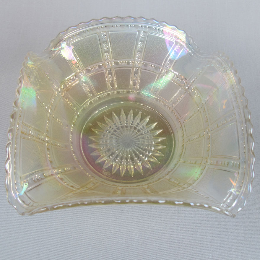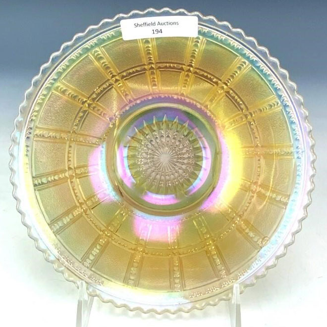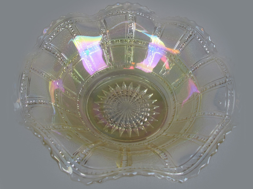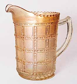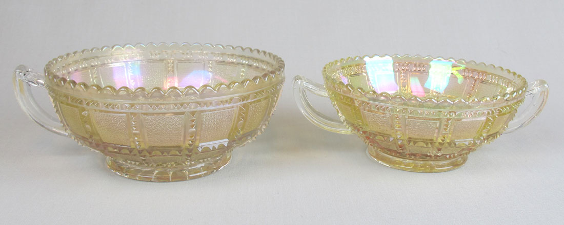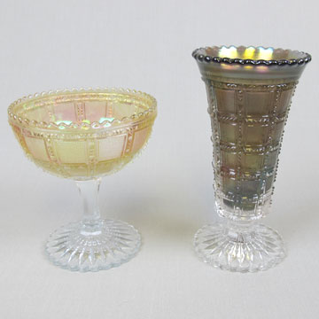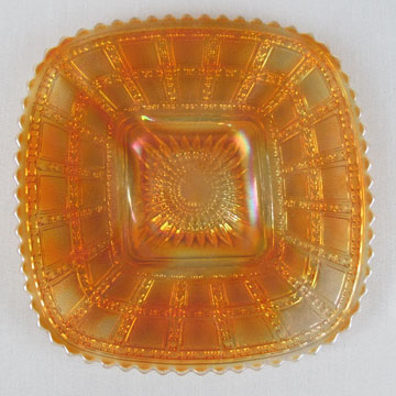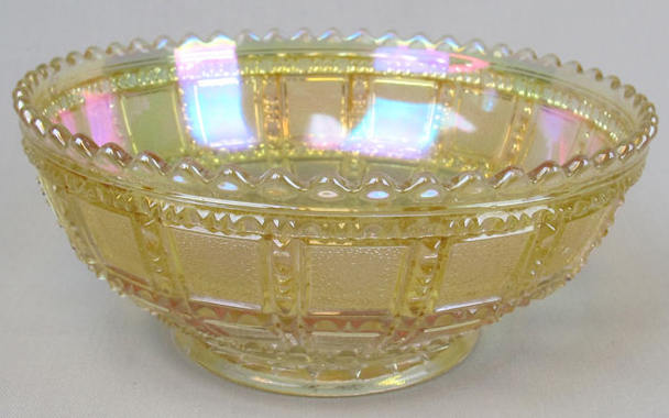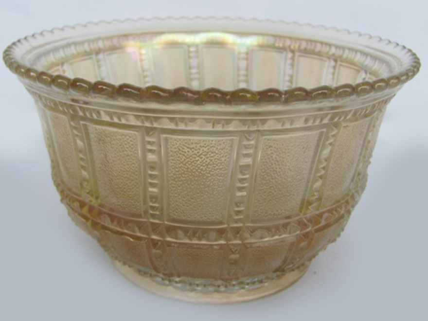 | A unique carnival glass exterior pattern of squares formed by vertical and horizontal rows of beads. The space within these squares has a stippled texture and thus the "frosted block".  The pieces have a sawtooth top edge and a plain interior. Made in the late time frame of the classic era into the depression era of carnival glass. In fact, this pattern is found more often in depression glass colors of light green, blue, amber and crystal. Collectors of depression glass would call this pattern "Beaded Block."  In carnival glass, pieces are known mostly in marigold and clambroth, and occasionally in smoke and white. The pattern appeared in Imperial's Bargain Book which is a collection of catalogs Imperial put together for marketing. Unfortunately these catalogs are not dated. In the Bargain Book, the pattern is listed with mold number 710. Many of the shapes that Frosted Block appears in are shown in two pages of the Bargain Book presented at the bottom of this page. |  |