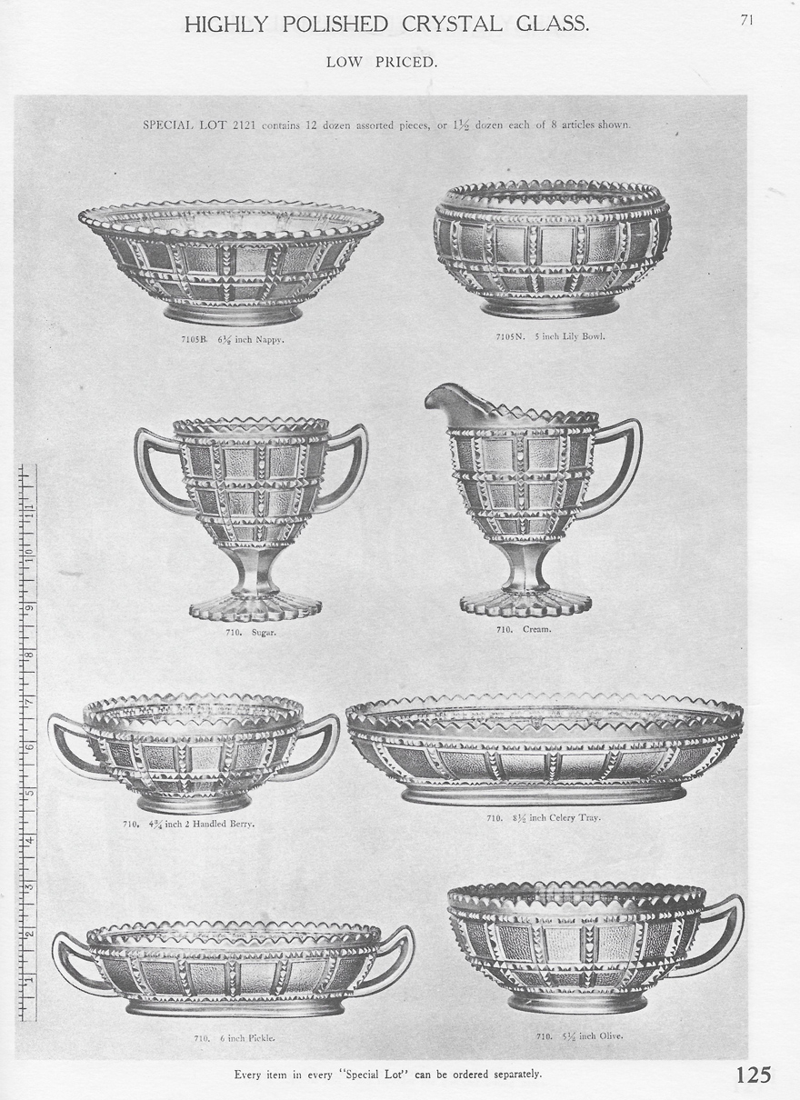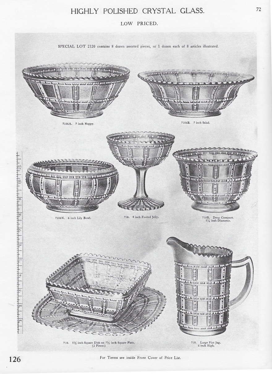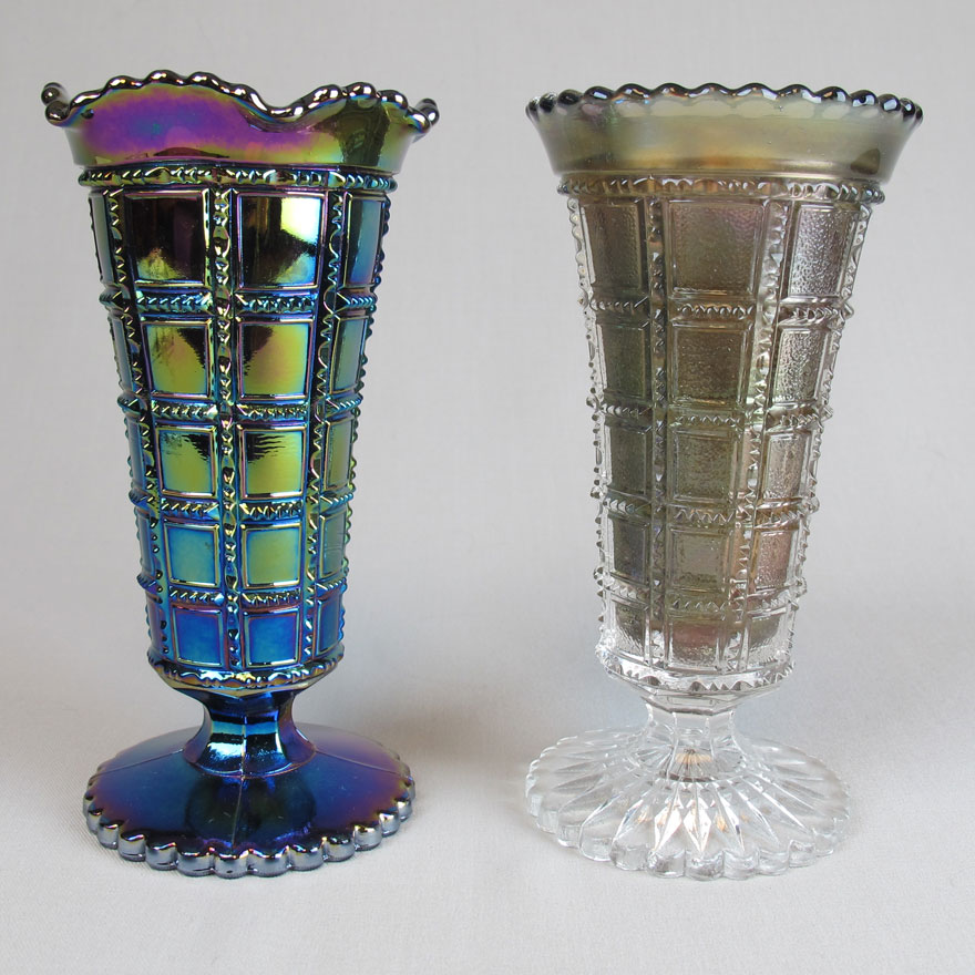 | A unique carnival glass exterior pattern of squares formed by vertical and horizontal rows of beads. The space within these squares has a stippled texture and thus the "frosted block".  The pieces have a sawtooth top edge and a plain interior. Made in the late time frame of the classic era into the depression era of carnival glass. In fact, this pattern is found more often in depression glass colors of light green, blue, amber and crystal. Collectors of depression glass would call this pattern "Beaded Block."  In carnival glass, pieces are known mostly in marigold and clambroth, and occasionally in smoke and white. The pattern appeared in Imperial's Bargain Book which is a collection of catalogs Imperial put together for marketing. Unfortunately these catalogs are not dated. In the Bargain Book, the pattern is listed with mold number 710. Many of the shapes that Frosted Block appears in are shown in two pages of the Bargain Book presented at the bottom of this page. |  |