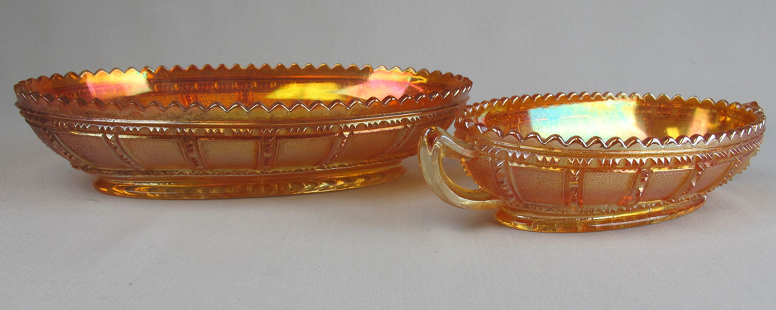 | The left photo shows shows a single handled nappy and a two handled bonbon. The single handled nappy, in clamroth, is 6 1/4 inches across including the handle and 5 3/8 inches across without the handle. The two handled bonbon, also in clambroth, is 6 1/4 inches across including the handles and 4 7/8 inches across without the handles. The right photo shows two relish dishes. The oval relish dish, in marigold and without handles, is 8 1/2 inches long and 5 inches wide. The oval two handled relish dish, also in marigold, is 7 3/4 inches long including the handles and 6 1/4 inch without the handles. |