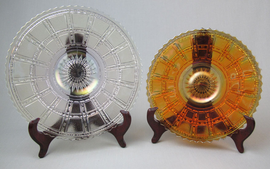 | Pictured above to the left is a 9 inch round plate in a very light clambroth and an 8 inch plate in marigold.  Plates in smoke may be found on the rare occasion. Also pictured above are a 7 inch round flared bowl and an 8 inch square bowl (4 sides up). Pictured below is a 6 inch across round bowl, a nut bowl and an 8 inch ruffled bowl. Imperial made good use of the two molds to make all the various plates and bowls shown. The smaller mold with 52 sawteeth made the smaller rosebowl, the 8 inch plate, the seven inch flared bowl and the six inch round bowl. The larger mold with 64 sawteeth made the larger rosebowl, the 9 inch plate, the four sided bowl, the nut bowl and the eight ruffled bowl. | ||