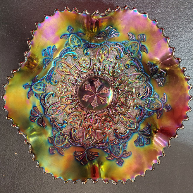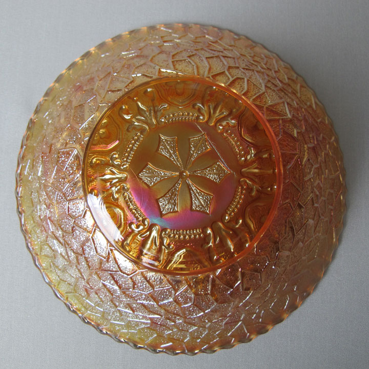 Garden Path has a complex design as demonstrated in the photo to the left. Most have the a soda gold pattern on the exterior as can be seen through the large ice cream bowl in purple on the left. To the right is the exterior of a flared bowl in marigold also showing the Soda Gold exterior.