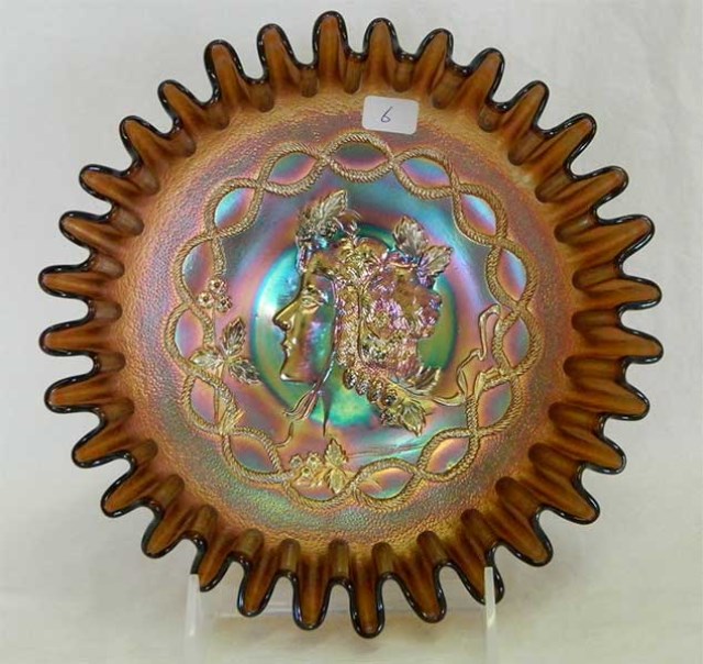 | The book Carnival Glass Identification Guide to Rare and Unusual Pieces by Bill Edwards and Mike Carwile shows a three-in-one and a six-ruffle bowl. They give some information about the face on the bowl. "According to Nellie Fenton Glasco, John Fenton's daughter (John Fenton was Frank L. Fenton's brother and co-founder of Fenton Glass), said in 1980 that this bowl was designed by her father and depicts her mother." Note: This has not been confirmed by any of the Fenton family.