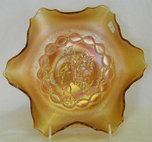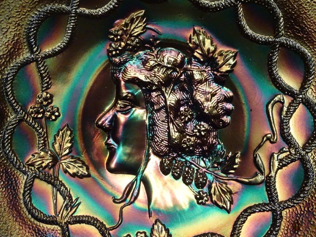 | A very rare pattern and extremely desirable. One of the few patterns in Carnival glass to show the human face or figure. Known in amethyst, blue, and marigold and in ice cream shape, ruffled, three-in-one edge and a tightly crimped version. | |