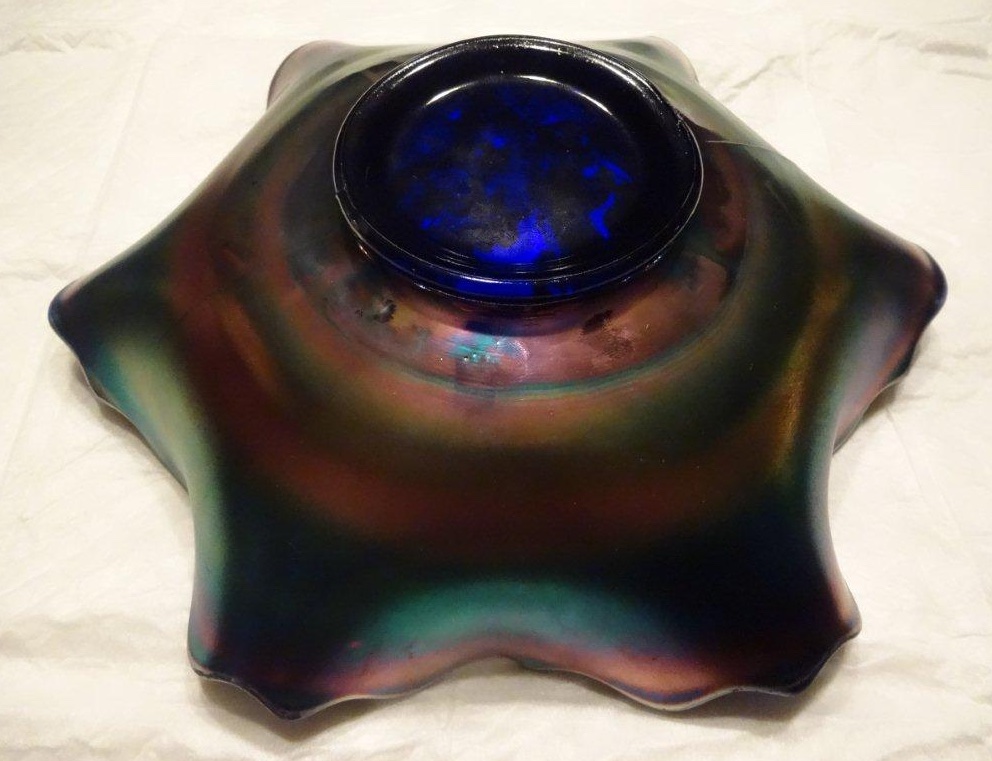 Blue Bowls Only two blue bowls are known, one has a tight crimped edge and the other has the six-ruffle edge. The tight crimped edge bowl sold at the September 13, 2014 Seeck auction of the Jackie Poucher collection, a memorable event hosted by HOACGA. The selling price was $52,500. According to an article in the December 2001 HOACGA newsletter by Jack Adams, the tight crimped edge blue bowl first appeared in the late 1960s when a couple from Bellefontaine, Ohio wrote to Rose Presznick inquiring about their bowl. She referred them to her book and she made them an offer. The couple also wrote to Paul Steiner, a carnival glass collector in Kenton, Ohio in late 1969. He went to see it, but he went home without the bowl that day. A few days later Mr. Steiner drove back, through a blizzard, and made a second offer. The couple promised to call him within two hours but when he did not receive the call, Steiner called and increased his offer by |