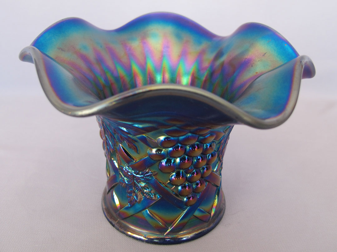 This pattern should not be confused with the identically named Dugan pattern which is found only in large fruit bowls. An occasional tumbler will have etched souvenir lettering. The only other shape is a whimsied hat made from the tumbler as pictured to the right. They should not be considered true whimsies as there are enough around to suggest that they were production items. These hats are found in blue, green, ice green, marigold and white. |