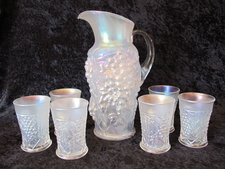 A dramatic use of the grape theme, the fruit on the pitcher is almost as large as the real thing. The grapes are combined with a lattice design around the base on both pitcher and tumbler. Water pitchers are found in amethyst, a rare blue, ice blue, ice green, marigold and white. Tumblers are found in additional colors.
