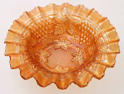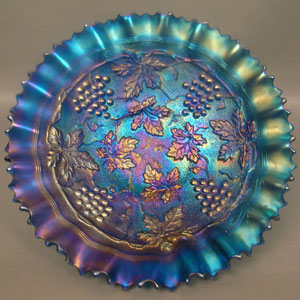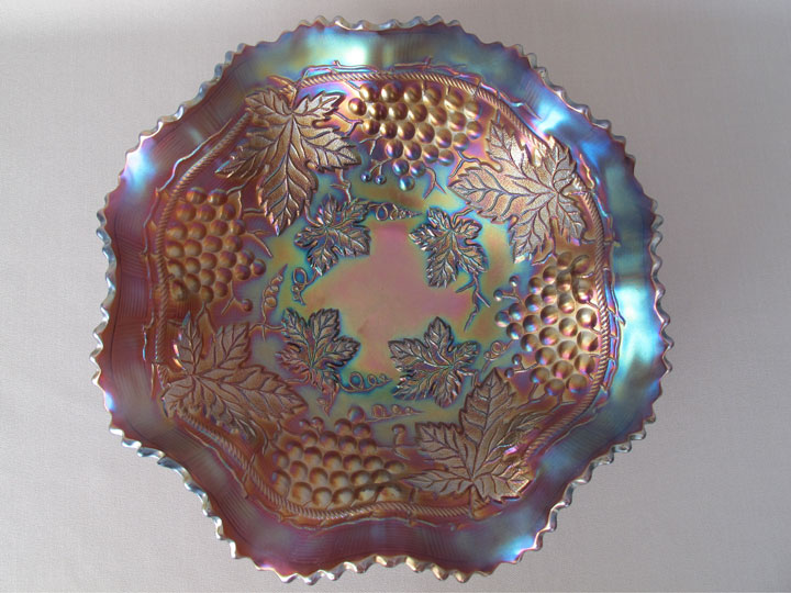 Spatula Footed Plate with Meander exterior. The grape and cable pattern is much more condensed to the center of the interior thus leaving a band of blank space around the outer rim. This is very similar to a Fenton Grape and Cable piece. We attibute these to Northwood due to the exterior pattern of Meander which is a mold purchased by Northwood from the Jefferson company and also used on Three Fruits pieces. Fenton pieces have a plain exterior. | Spatula Footed Bowl with Meander exterior. The ruffled bowl shape came from the same mold as the plate to the left and is actually much harder to find.
