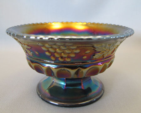 Small bowls and plates all came from the same mold. Each has a base diameter of 2 1/2 inches and are about 6 inches across depending on how the piece was shaped. There are four clusters of grapes and four grape leaves around the interior of the pieces. The exterior is the classic Northwood basketweave pattern. There are five shapes: plates, six ruffle bowls, double hand grip plates, ice cream shaped bowls and single hand grip plates. They come in amethyst, green, marigold, ice green and white. | Centerleaf bowls and plates are the next size up and all came from the same mold. They have a 3 1/4 in base diameter and are about 7 1/2 inches across depending on the shaping. There are four clusters of grapes and four grape leaves around the interior of the pieces. In the center of the interior is a single grape leaf. The exterior has the basketweave pattern. A variant has a plain exterior with a poppy in the marie. There are four shapes: plates, six ruffle bowls, double hand grip plates and single hand grip plates as shown. They come in amethyst, blue, green, marigold, ice blue and white. A ruffled blue center leaf bowl is known to be stippled. | Bon Bons and Card Trays are two handed bowls. The design has a center leaf. Bon Bons have all four sides pulled up while Card Trays have only two sides pulled up. The exterior has the basketweave pattern.
