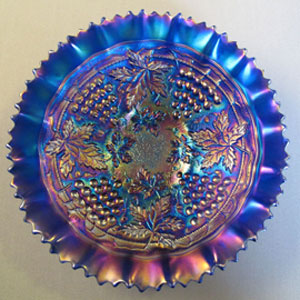Large Bowl, Ruffled. These largest bowls come Ruffled, PCE or in the ice cream shape but all came from the same mold. The base diameter is 4 1/4 inches on each and they can be 10 to 11 inches across depending on the shaping. The eight ruffle piece is found in amethyst, blue, green, marigold and white. | Large Bowl, Pie Crust Edge. These are referred to as "Salad Bowls" and come in amethsyt, green, marigold and white. | Large Bowl Ice Cream Shape The master ice cream bowls could have been paired with six of the smallest Grape and Cable ice cream shaped bowl pictured in White above to form an Ice Cream Set. However, there seem to be many more master sized ice cream bowls than individual sized ice cream bowls leading us to believe these large bowls were typically sold as a single piece. These pieces come in amethsyt, blue, green, marigold, ice green, ice blue and white. |