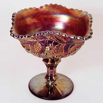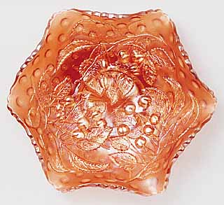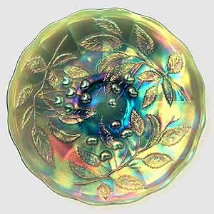 Hanging Cherries is also found with a hobnail pattern on the reverse. While the front pattern is the same as regular Hanging Cherries, this rare version has a hobnail design on the back (visible through the front in this photo to the right). Shown is a 10-inch bowl in marigold. |