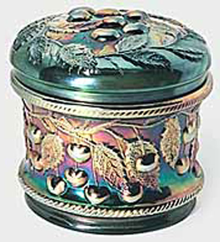 Compotes are usually round or flared, but there are a few square examples as shown here. The Hanging Cherries powder jar is rarely seen. |