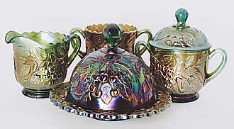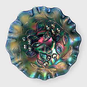 This pattern is sometimes called Millersburg Cherries. The cherries "hang" into the middle of bowls and plates, toward the bottom in other shapes. Above left is a green 8-inch plate, the only one known in this color. Second to the left is a blue three-in-one sauce, a rare color for Millersburg though these sauces are not too hard to find.