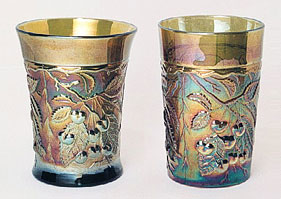 Hanging Cherries is also found in both a water pitcher and a milk pitcher (about 7 inches to top of spout). There are two versions of the milk pitcher. On the left is the one you'll more likely see; there are only two known in the version in which the sides drop straight down. Tumblers are also found in a variant, like the one on the left with the flared top, and are known in amethyst, green, and marigold. Some tumblers have bases ground when they were made.