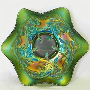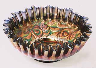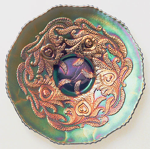| Heart and Vine is found in plates and bowls with three-in-one edges, ruffled, and the candy ribbon edge shown above. The plate on the left is blue with green iridescence.
