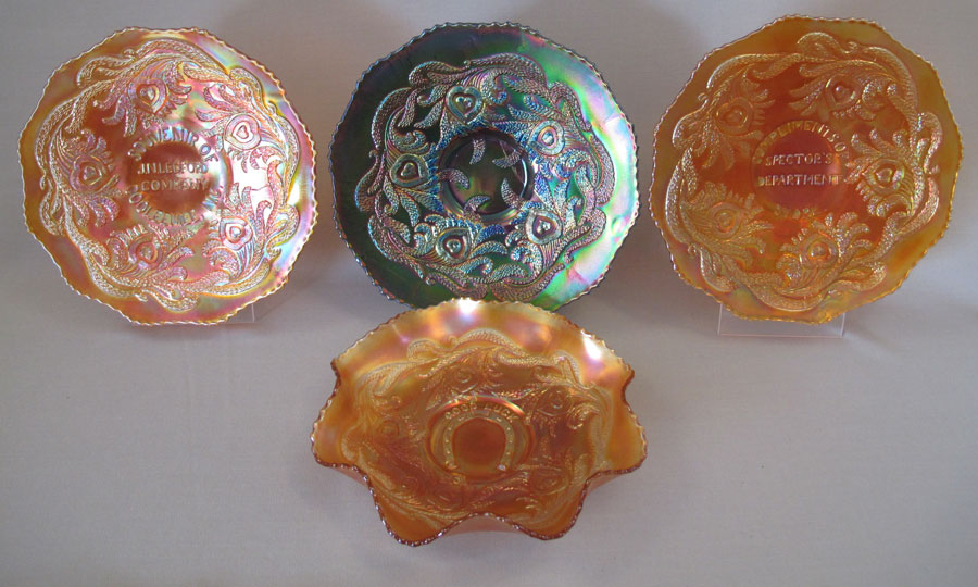 Plates can be found in amethyst, blue and a very rare marigold. Bowls can be found in amethyst, blue, green and marigold. The photo, above to the right, is of a bowl that collectors call Heart and Vine Variant. Note that while it is the same essential pattern as that to the left, it has less detail in the wreath of leaves which are smaller and more delicate. This leaves clear blank spaces within the pattern. Heart and Vine and Heart and Vine Variant are both found easily. As shown below, the pattern was used as the basis for Fenton's Good Luck bowls with the addition of a horseshoe and the words "Good Luck" in the center and also used as the basis for two advertising pieces: Spector's Department Store plate and the J N Ledford plate. |