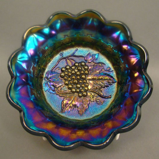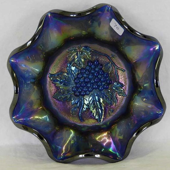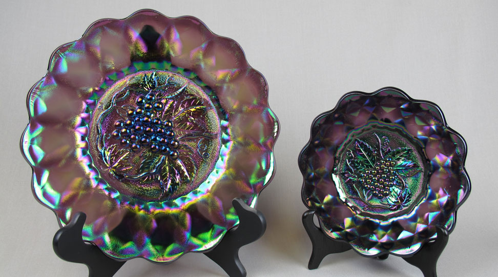 Heavy Grapes many shapes are; 5-6 inch small bowls, 7-8 inch medium bowls, 9-10 inch large bowls, single handled nappies, rare 6 inch plates in marigold, 7-8 inch plates, rare 9 inch plates, and 10-11 inch chop plates. The large bowls, when combined with six small bowls, would form a berry set. The 7-8 inch plate is seen more frequently than any other shape. Bowls and plates are found in clambroth, green, Helios, lavender, lime green, marigold, purple, smoke, teal, and white. Purple is the most available color. Amber, green, marigold and smoke can be found with some regularity. Other colors would be scarcer. |
