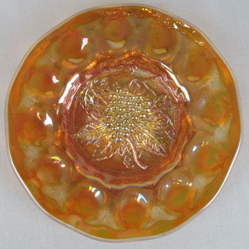 The photos above show the difference between scalloped edge plates and smooth edge plates. Smooth edge plates are rather rare and only seem to appear in the 8 inch size and only in marigold. The last photo, to the right, shows the exterior fluted thumbprint design typical of all bowls and plates. |