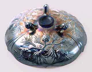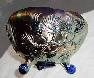 A rare pattern found on the exterior of 10 inch footed bowls. Marigold, blue, amber, and white are known. The above blue example has spectacular iridescence on the front. In 2006, Linda Stumbo sent in this photo of her Heavy Pineapple rose bowl in blue.