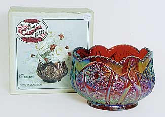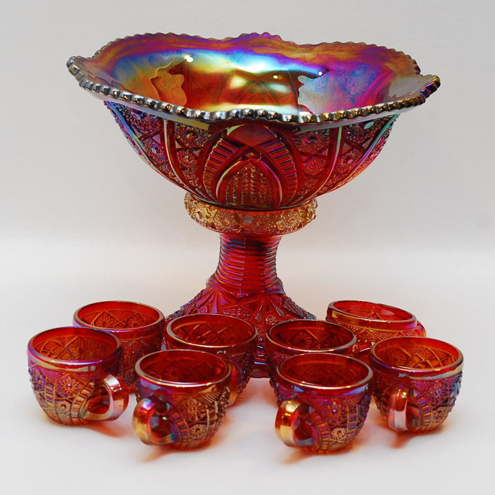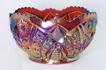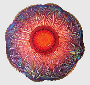 Seen almost as often as the Harvest pattern, Indiana's Heirloom is their version of a cut-style pattern. Mostly seen in red but occasionally in amethyst. None of the pieces are marked. Molds for the Heirloom pieces were acquired from Mckee Glass which closed in 1954. Mckee called the pattern "Concord". | ||