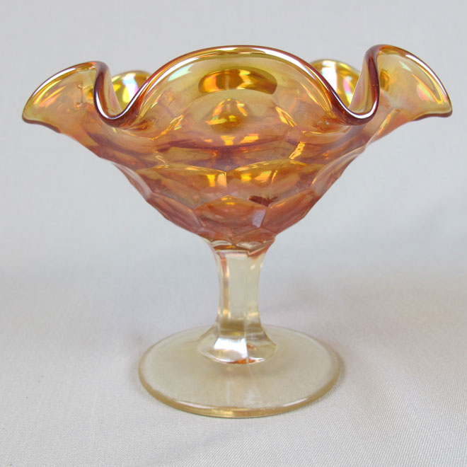 Only found in marigold, this compote is made by Imperial. The interior of the bowl is ribbed and the eight sided stem has a bulge towards the top. The compote is about 5 1/4 inches tall and about 5 inches across the top. |