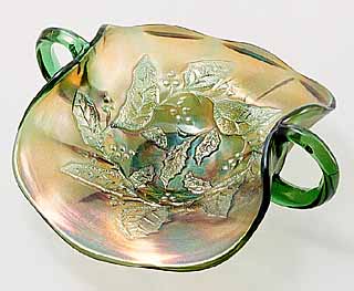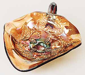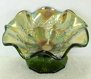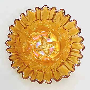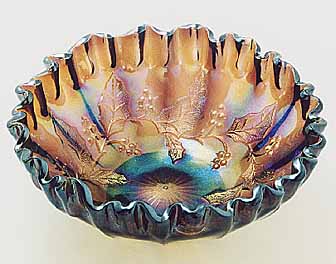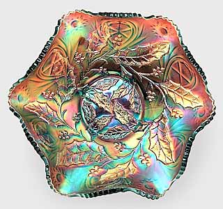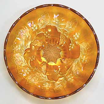 At one time, collectors referred to this pattern as Holly Whirl (upper left) or Holly Sprig (upper right). As both patterns are the same, given differences in size and variations in the center, many collectors now refer to it simply as Holly. The large bowls have the leaves covering the center, the Near Cut Wreath exterior, and a sawtooth edge. Some are known with variant centers such as this 8-inch Holly Whirl bowl (lower left) with the 8-point star center and this 6½ inch sauce (lower right) in Holly Sprig with the feather center.