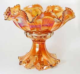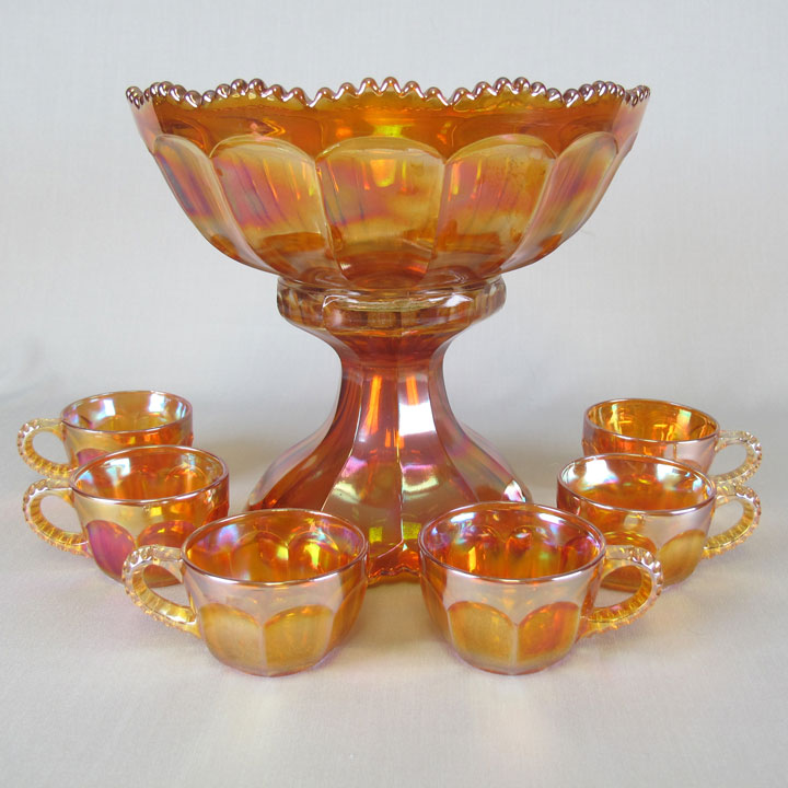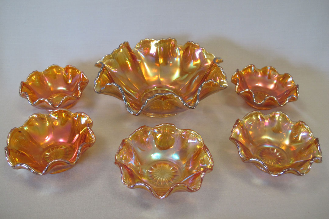 | Pictured above to the left is a berry set (minus one berry bowl). These bowls have a sawtooth edge just as the punch bowls do, although it is less pronounced. The exterior also have a fainter flute pattern than the punch bowls but it is there. While mostly found in marigold, berry set can also be found in green or smoke and even an extremely rare blue.