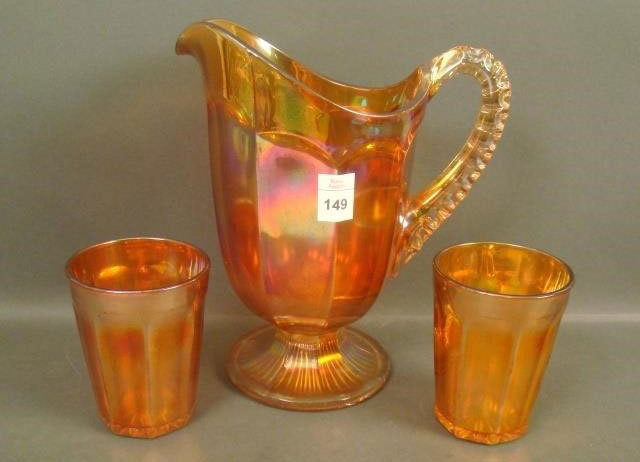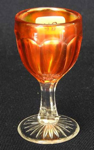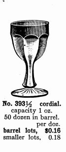 This pitcher, on the right, is part of the #393 line. It would have come with six #393 tumblers to form a water set. Water sets are only known in marigold. Thanks to Burns Auction Services for this photo. Sometimes auctioneers will list a marigold Imperial Flute wine. It is most likely also part of the 393 line. To the right is a picture out of Imperial's 1909 catalog showing a 393 1/2 cordial, as well as, a photo of an actual cordial. These cordials have only been found in marigold. Thanks to Hooked on Carnival for the cordial photo. The 1/2 after the mould number means that the glass is not fine crystal glass but economy glass used by Imperial. |