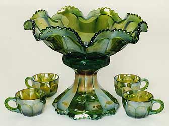 | Imperial produced three seperate flute pattern lines, #393, #672 and #700, calling them Colonial pattern lines. Shown above are three punch sets from the Flute #393 line. Punch sets, as well as a few other large bowls have a "9" listed after the pattern number--#3939. Punch sets are only found in the green and marigold shown here.
