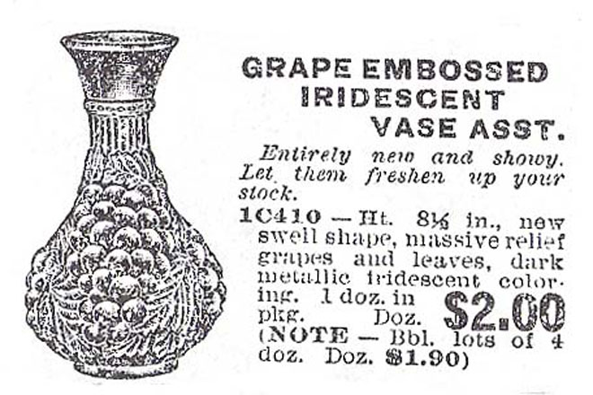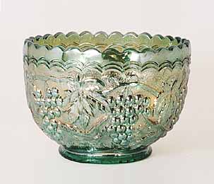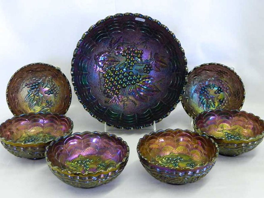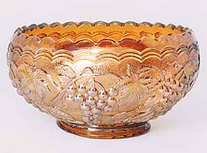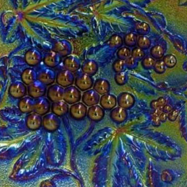 This was Imperial's equivalent to Northwood's Grape and Cable and the line includes most of the common shapes found in Carnival. There is one large gouping of grapes and leaves in the center of plates and bowls or around pitchers, tumblers and goblets. The outer edge of the pattern typically has lines in a scallop shape.