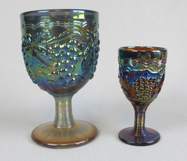 Above center are a water goblet and a wine glass. The goblets are 5 1/4 inches tall with a 3-inch base. The wine glass is 4 inches tall; some have a starred base, others are plain. Goblets are found in amber, green, Helios, marigold, purple and smoke. This goblet, in smoke, is a reproduction and is marked on the bottom with an "IG". Original goblets have a grape pattern on the inside as well as on the outside while the reproductions have a plain interior. Wines are found in blue, green, Helios, lavender, lime green, marigold, olive, purple, smoke and vaseline. Wine sets consist of a decanter and six wine glasses. Stoppers are often missing on the decanter, which lowers the value considerably. Wine sets are found in amber, green, marigold, purple and smoke. |