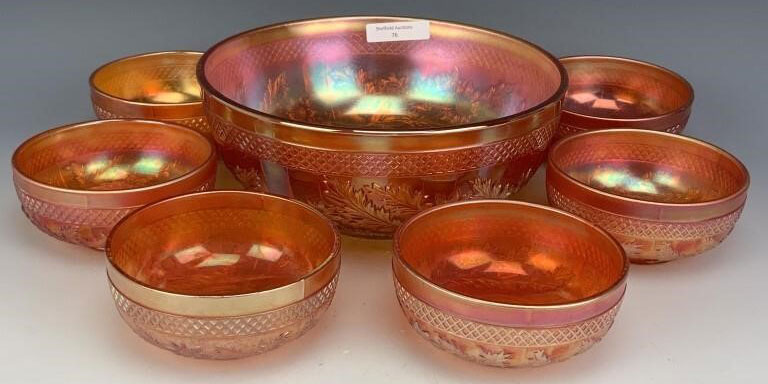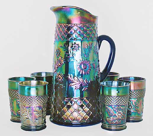 Found only in water set pieces with a tankard-style pitcher as shown to the left and an occasional round berry set or bowl as shown below. Full berry sets are to be cinsidered rare. Found mostly in blue and marigold and amethyst on occasion. |