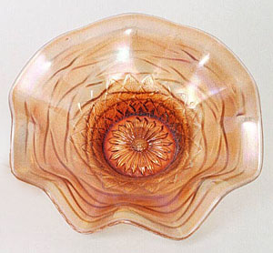 The pieces shown here are a blue vase, an amethyst hat, a white ruffled bowl and a marigold plate. Other colors include lavender and peach opal. All the pieces shown above have the interior daisy pattern except the hat which has a plain interior. |
