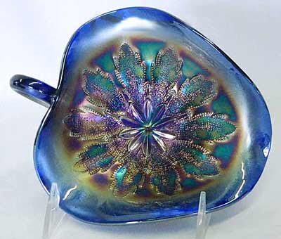 This nappy in blue, a scarce color for Dugan, sold at the 2012 Heart of America Carnival Glass auction. Photo courtesy of Seeck Auctions. The nappies are about 6 1/2 inches long, 5 1/2 inches wide and only 2 inches tall. Colors found include amethyst, blue, lavender, lime, marigold, peach opal, pink and white. |