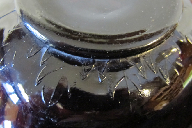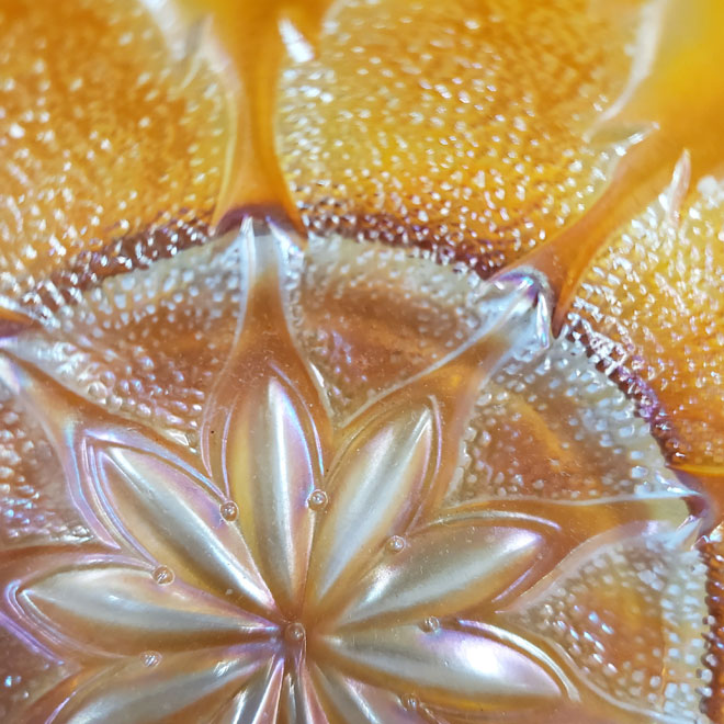 There are also two variations of the Leaf Ray nappy. The photos below show the subtle difference. In the photo to the left, the stippled leaves touch most of the center petals. In the photo to the right, there is a smooth unstippled space that separates the leaves from the petals. Was there only one mold which was at some time modified or were there at least two molds used to make the Leaf Ray nappy. Given the quantity of these found today, it is probable that more than one mold was used to produce all of them. |